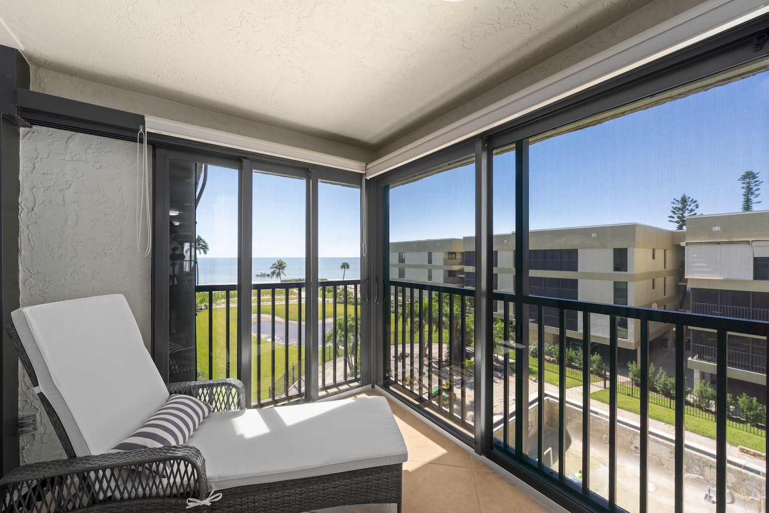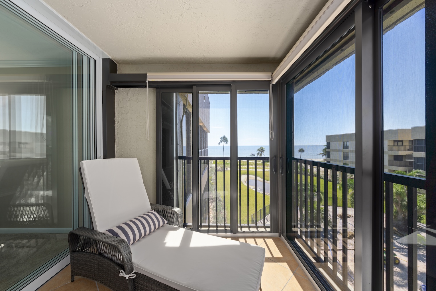 Condo amenities include: 2 bedrooms -- 1 King bed, 1 Queen & 1 Twin bed (sleeps 5) & 2 bathrooms, 3 flat screen Smart TVs (streaming only), free WIFI, shared heated pool, in suite washer & dryer, screen enclosed lanai, elevators, covered parking. No Pets allowed. Bed linens and Bath towels included. Beach chairs, beach towels, and an umbrella are provided for added convenience.