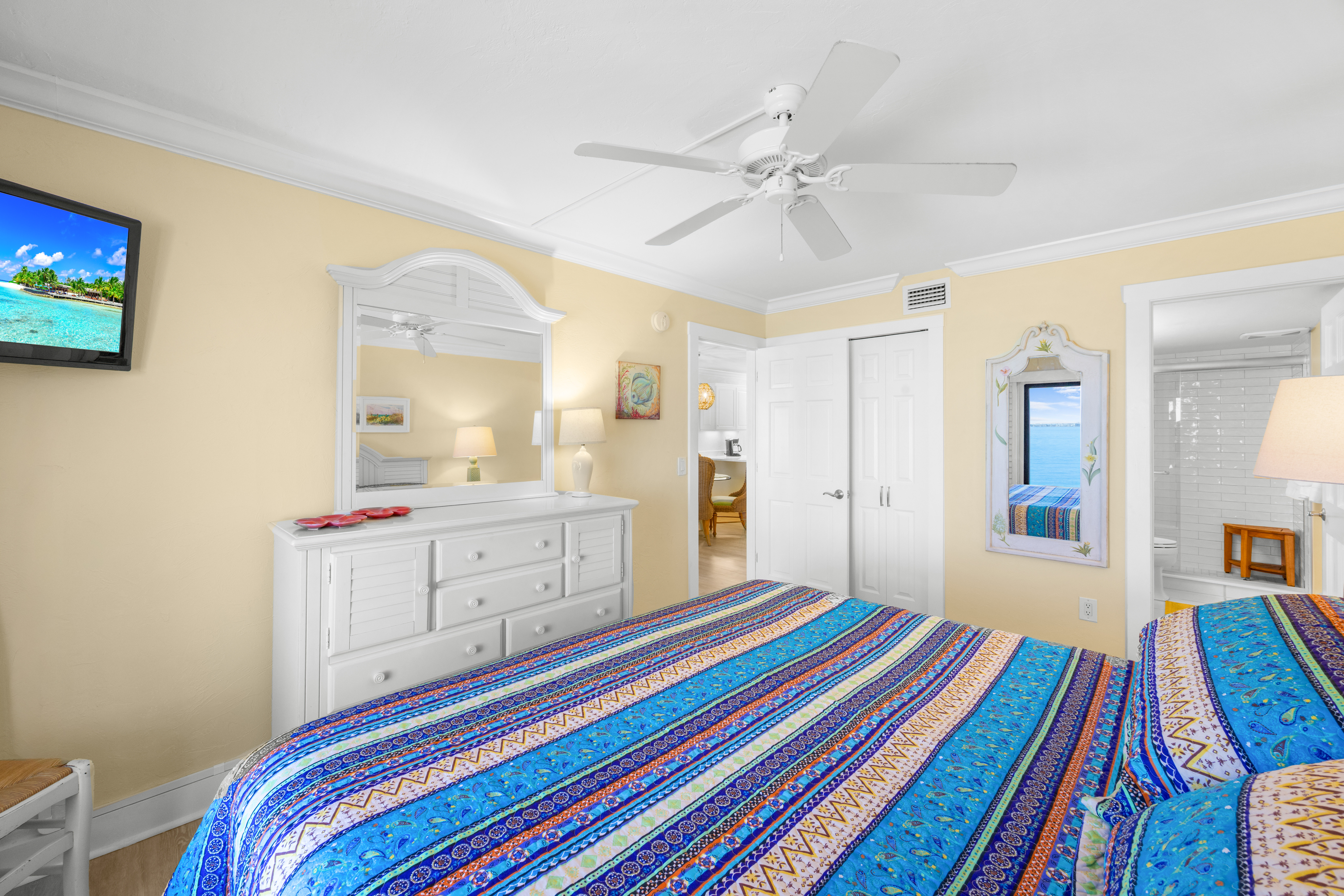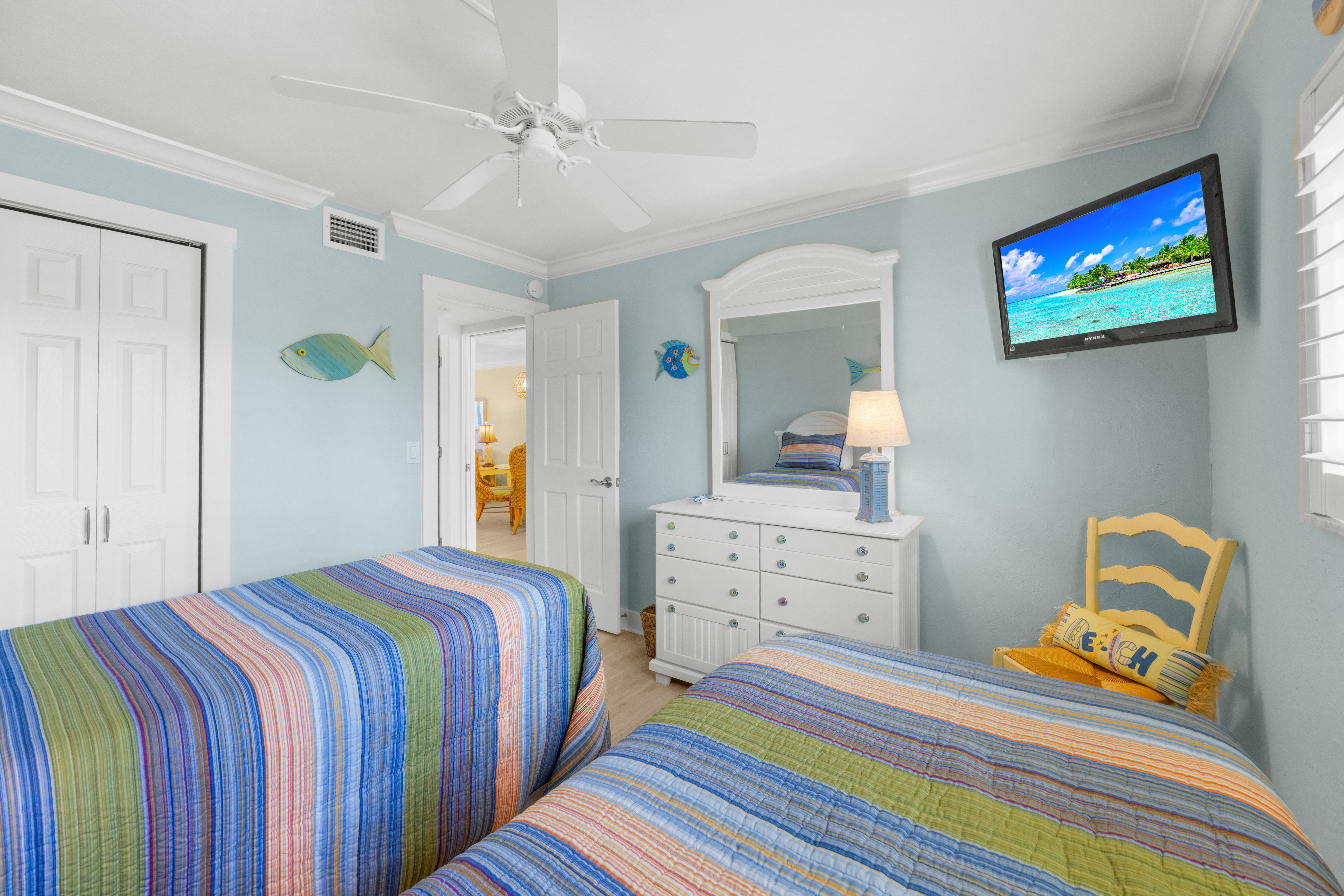 Condo amenities include: 2 bedrooms/2 bathrooms -- 1 King bed & 2 Twin bed (sleeps 4), Smart TV's (streaming only), WIFI available, fully equipped kitchen, in-suite washer & dryer. Bed linens and Bath towels included. This unit comes stocked with beach chairs, beach towels and an umbrella. No elevator access. No Pets allowed.