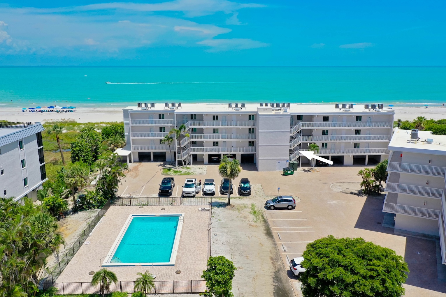 Condo amenities include: 2 bedrooms/2 bathrooms -- 1 King bed, 2 Twin beds & 1 rollaway Twin bed (sleeps 5), Smart TVs (streaming only), WIFI available, shared heated pool, in-suite washer & dryer, screened-in lanai, public BBQ gas grills, shuffleboards, tennis & pickle ball courts, elevators, covered parking. No Pets allowed. Bed linens and Bath towels included. Beach chairs, beach towels, and an umbrella are provided for added convenience.